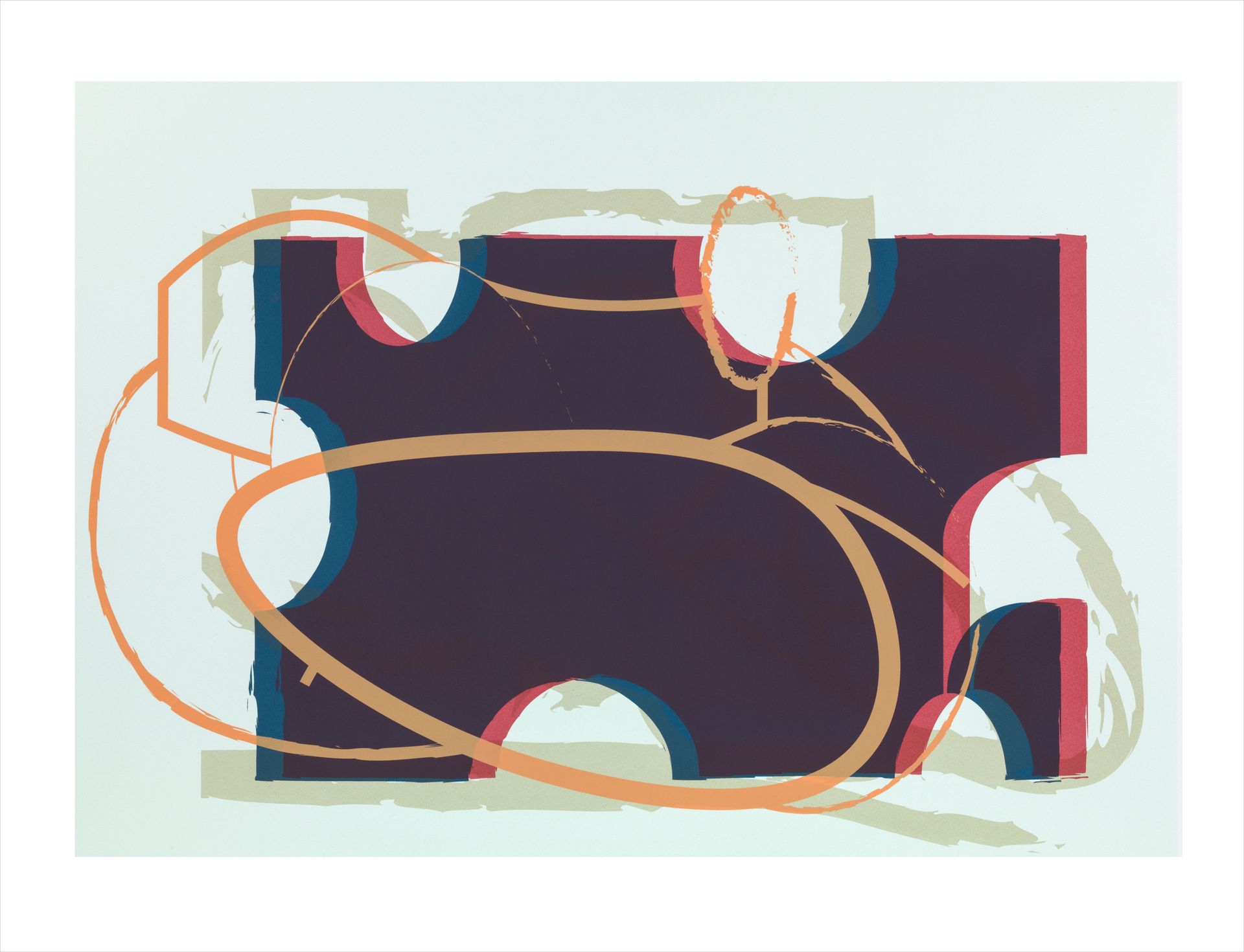 When we made flat grounds, (underprintings), we decided to break them up, to introduce divisions in them to see how these might react with all the other elements. When they were broken horizontally, it immediately created a landscape. When broken vertically or diagonally, they created a kind of proscenium arch. In its own way, the random became the predictable.