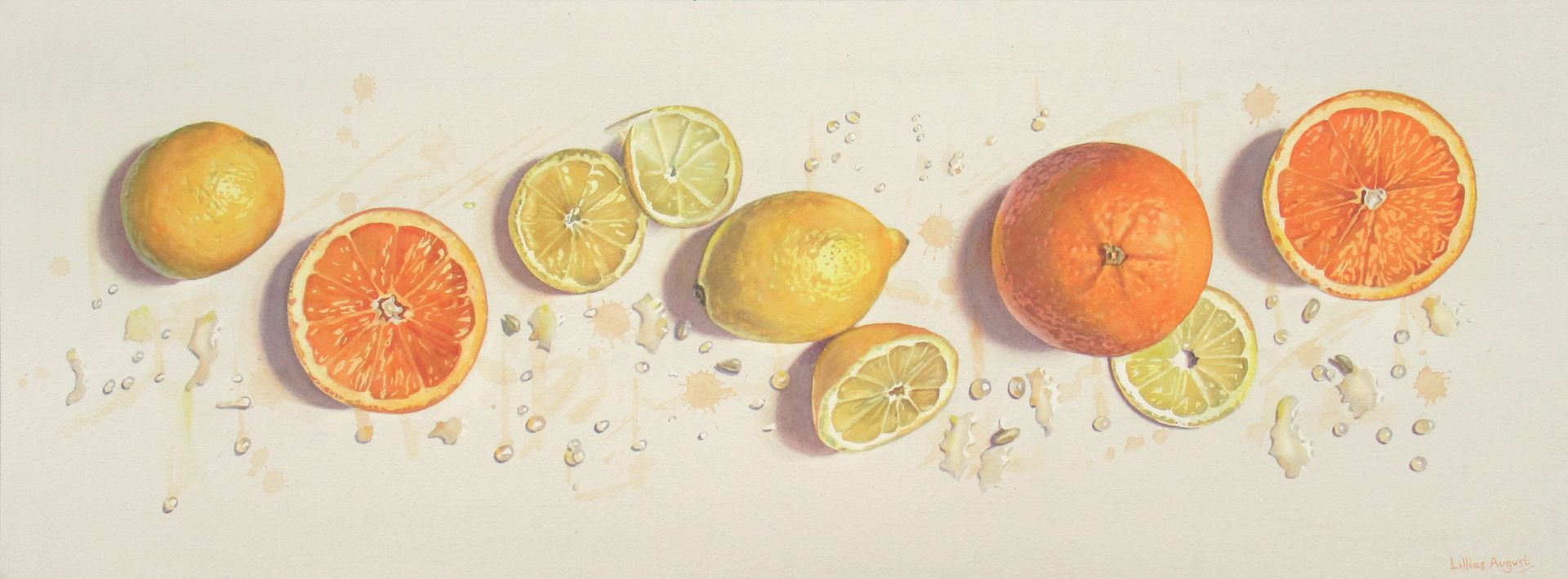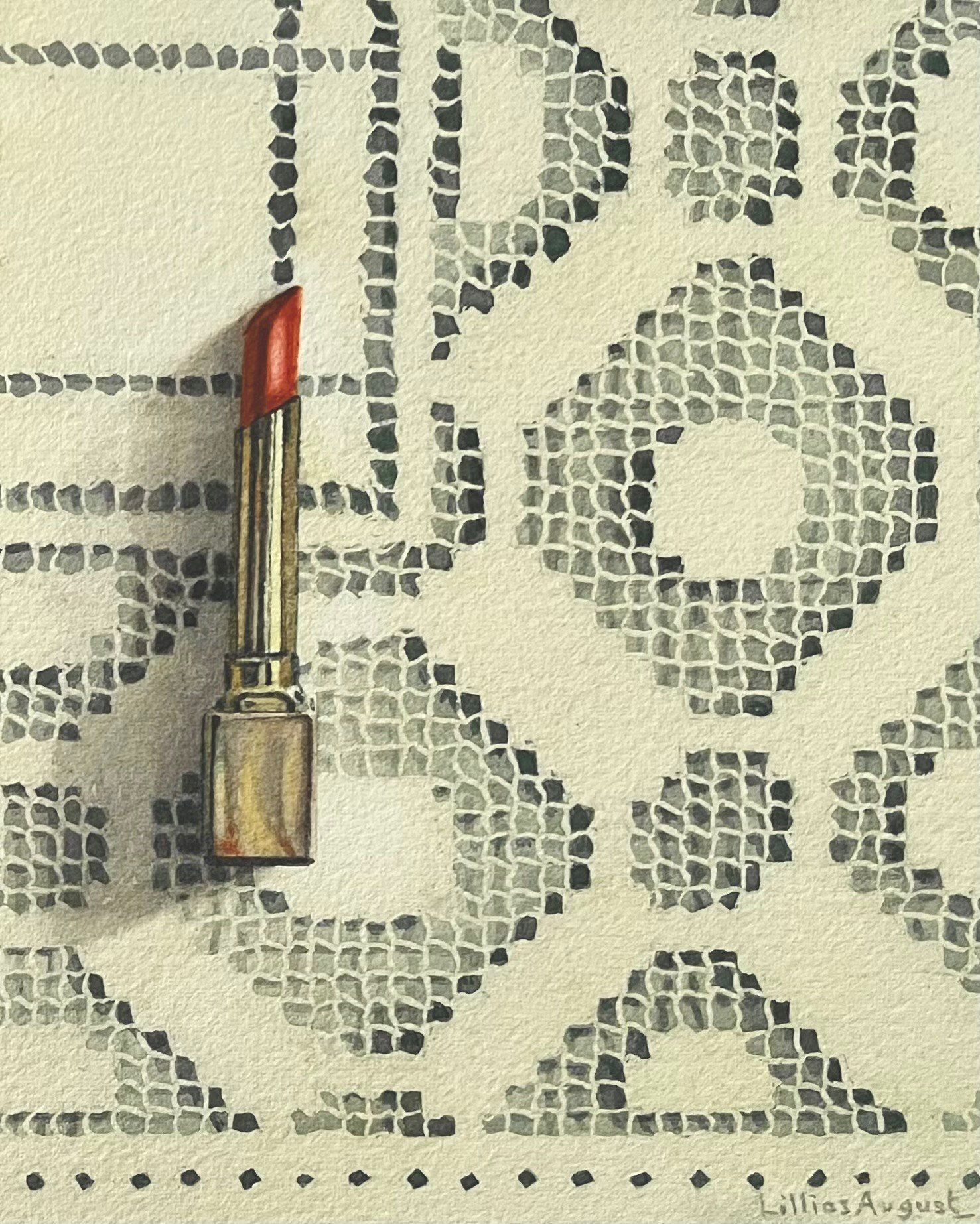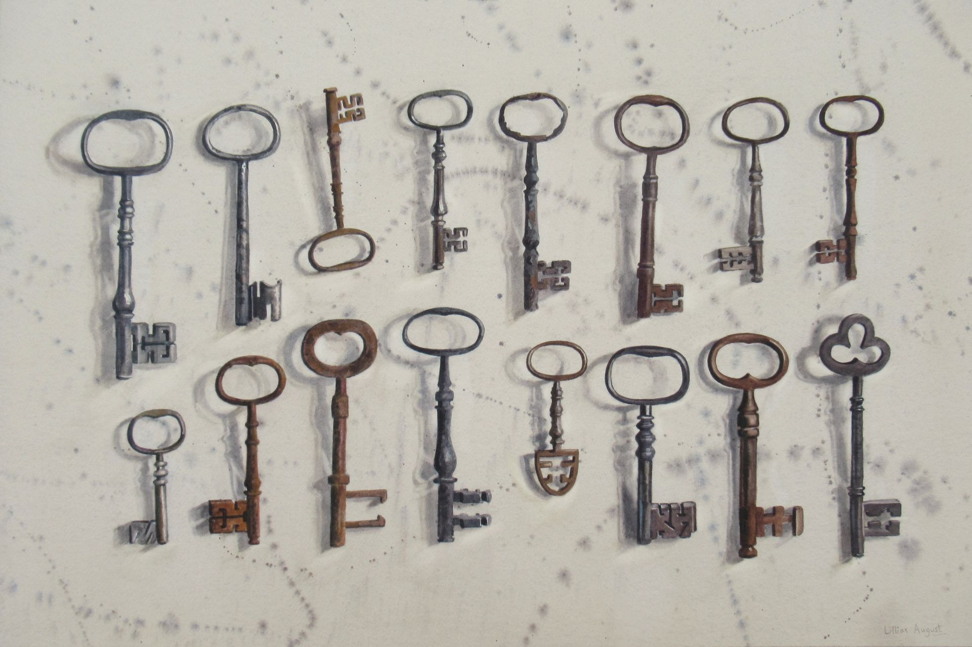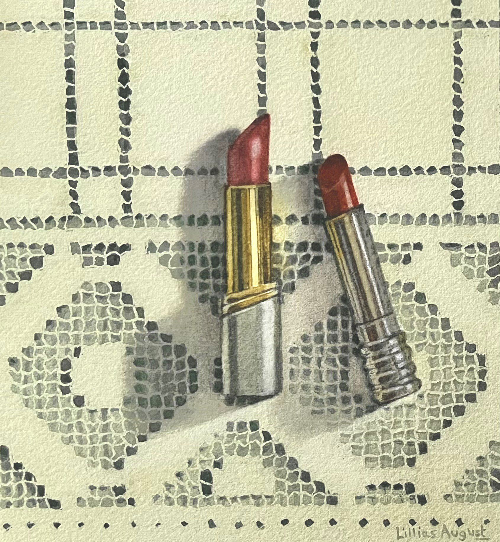 Lillias August is a contemporary “Pop-Still Life” artist working with precision to detail in pencil and watercolour. Her captivating recent works form kitsch and intimate studies of ordinary things presented in an extraordinary way. Through her acute observational skills she explores a visual tale which goes beyond realism giving life and purpose to the superfluous. Lillias’s paintings are daringly ingenious as they beckon the viewer to examine a composition where something powerful is conveyed; lipsticks in a line, keys, mobile phones or knives can carry a sinister message or simply arrest the observer and take them out of their comfort zone.