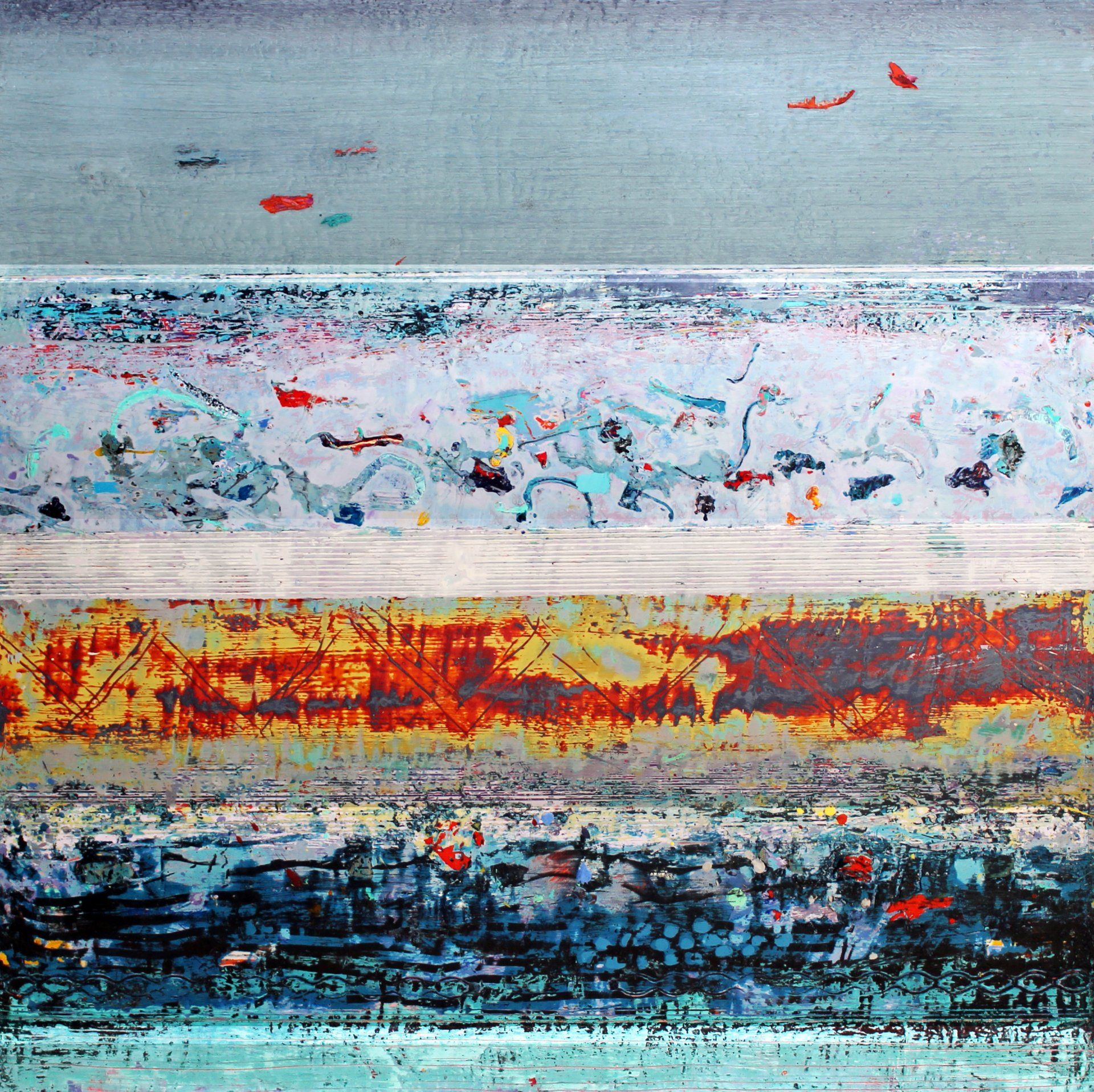 David Hayward is a British abstract artist who lives in Kent. He studied at the Royal College of Art, Brighton Polytechnic, Canterbury School of Art & Architecture and Cheltenham College of Art & Design. His work combines a preoccupation with formal abstraction and reflections upon the outside world. Thoughts and memories of places and events drive decision-making and inform the direction of each painting. References can include geological structures and transient systems such as weather, erosion, time and sound. His use of encaustic (oil colour dissolved in molten wax) facilitates over-painting and reclaiming underlying layers which gives his work a heightened physical as well as optical quality.