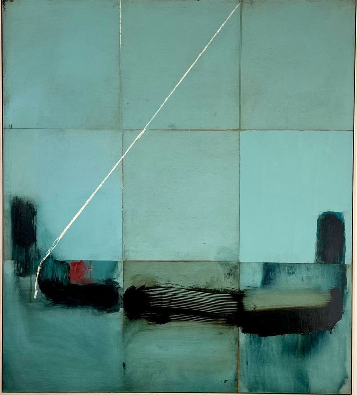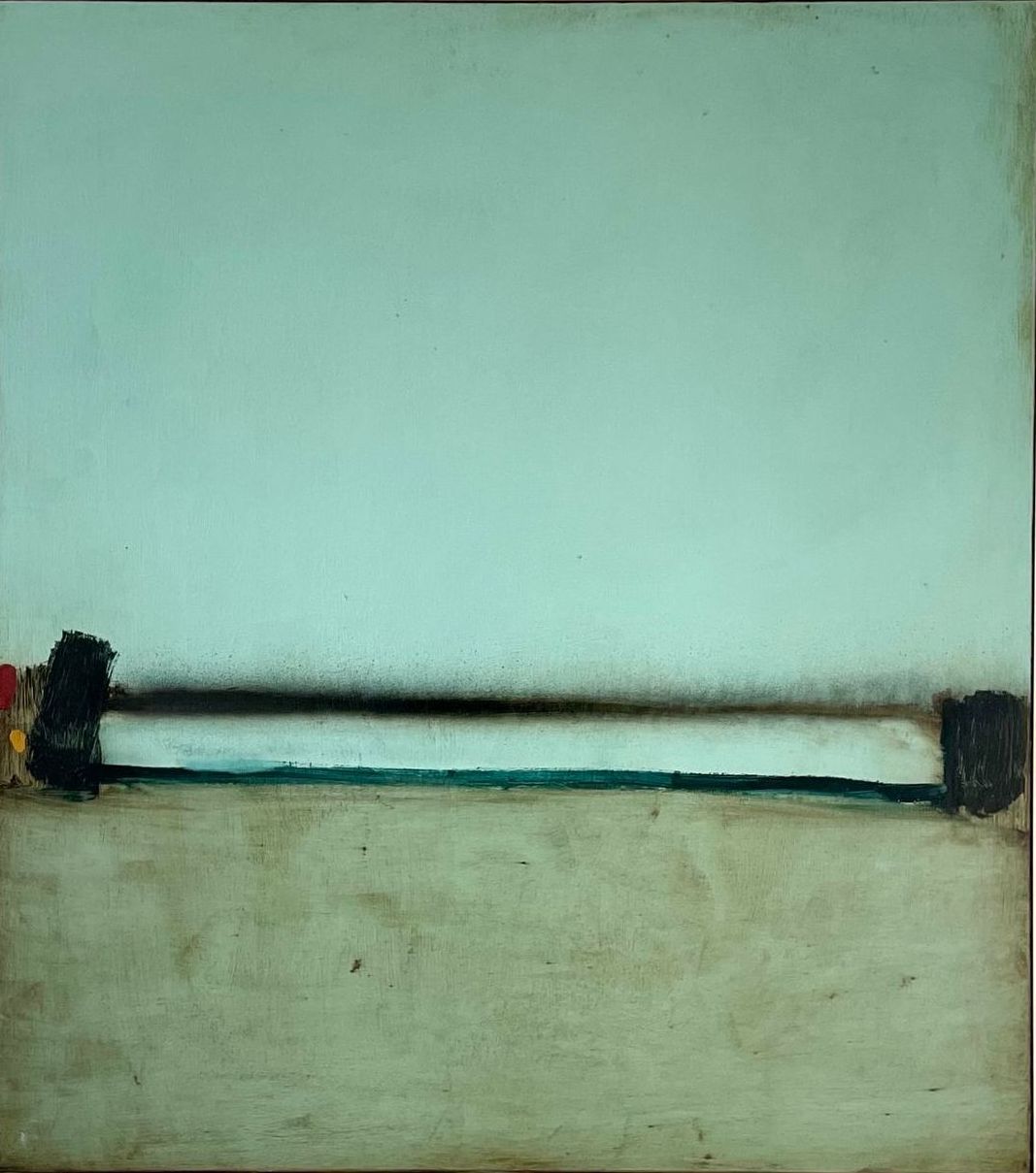 Other figures seem to want to signal, make contact or transmit, 'Pylon' is a good example, the derelict military radar research establishment on Orfordness might be a source for this, I detect this need in Adam's work too, his 'Boat' painting depicts a buried form, the lines leading from it could be sending or receiving a signal, It is also there in 'Two competing cranes' and 'Roads'.
