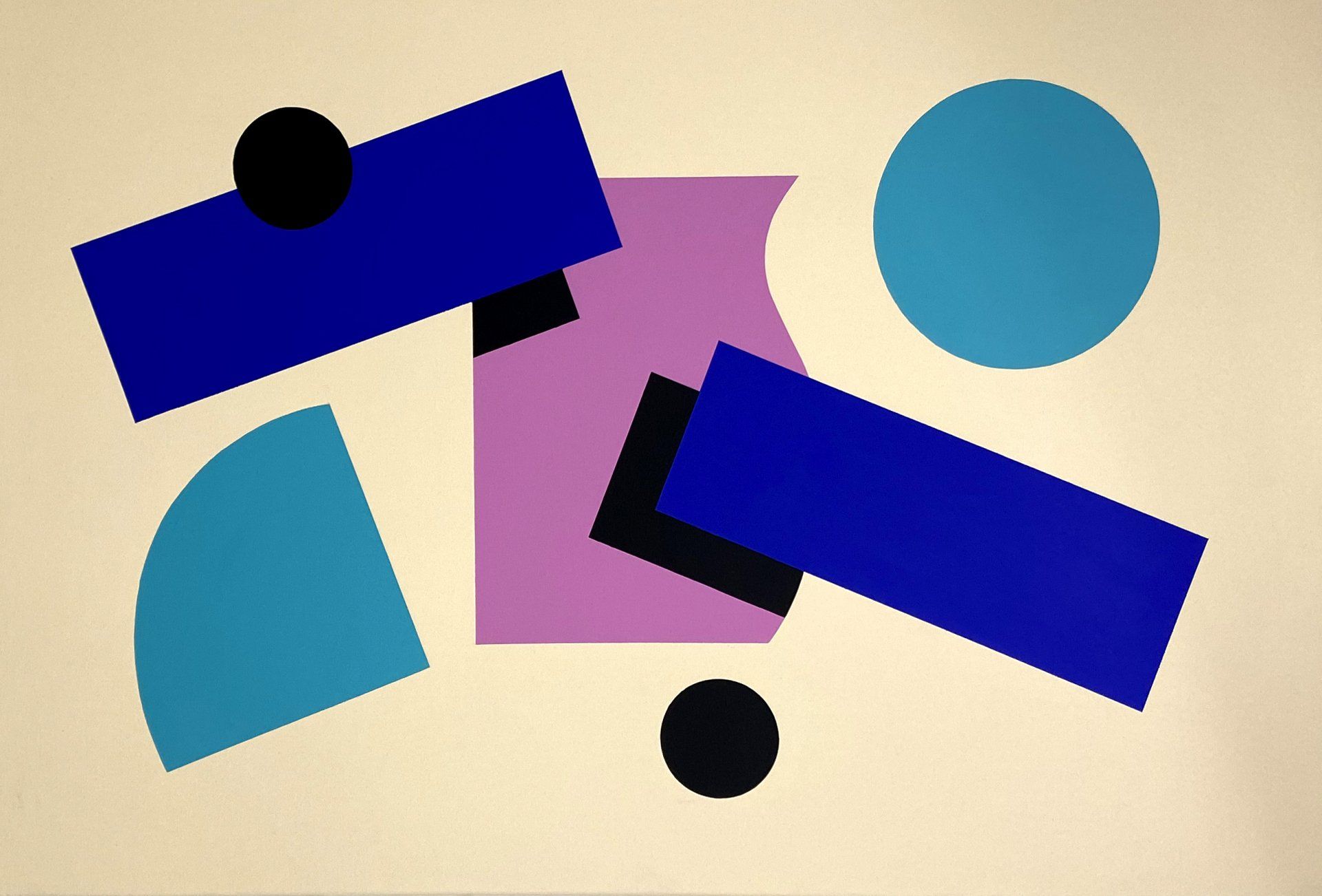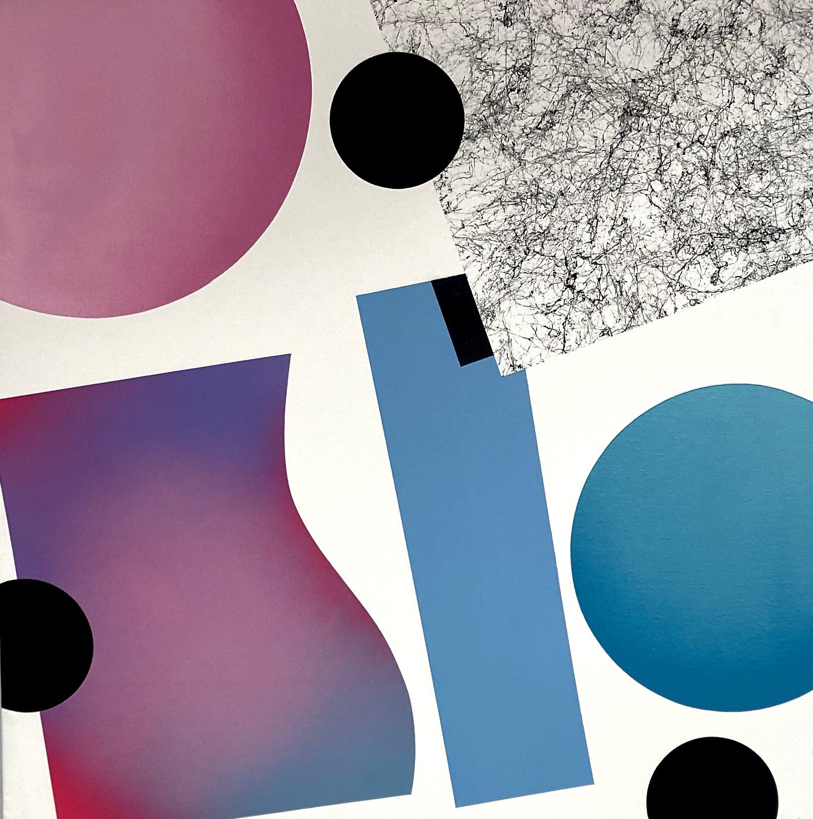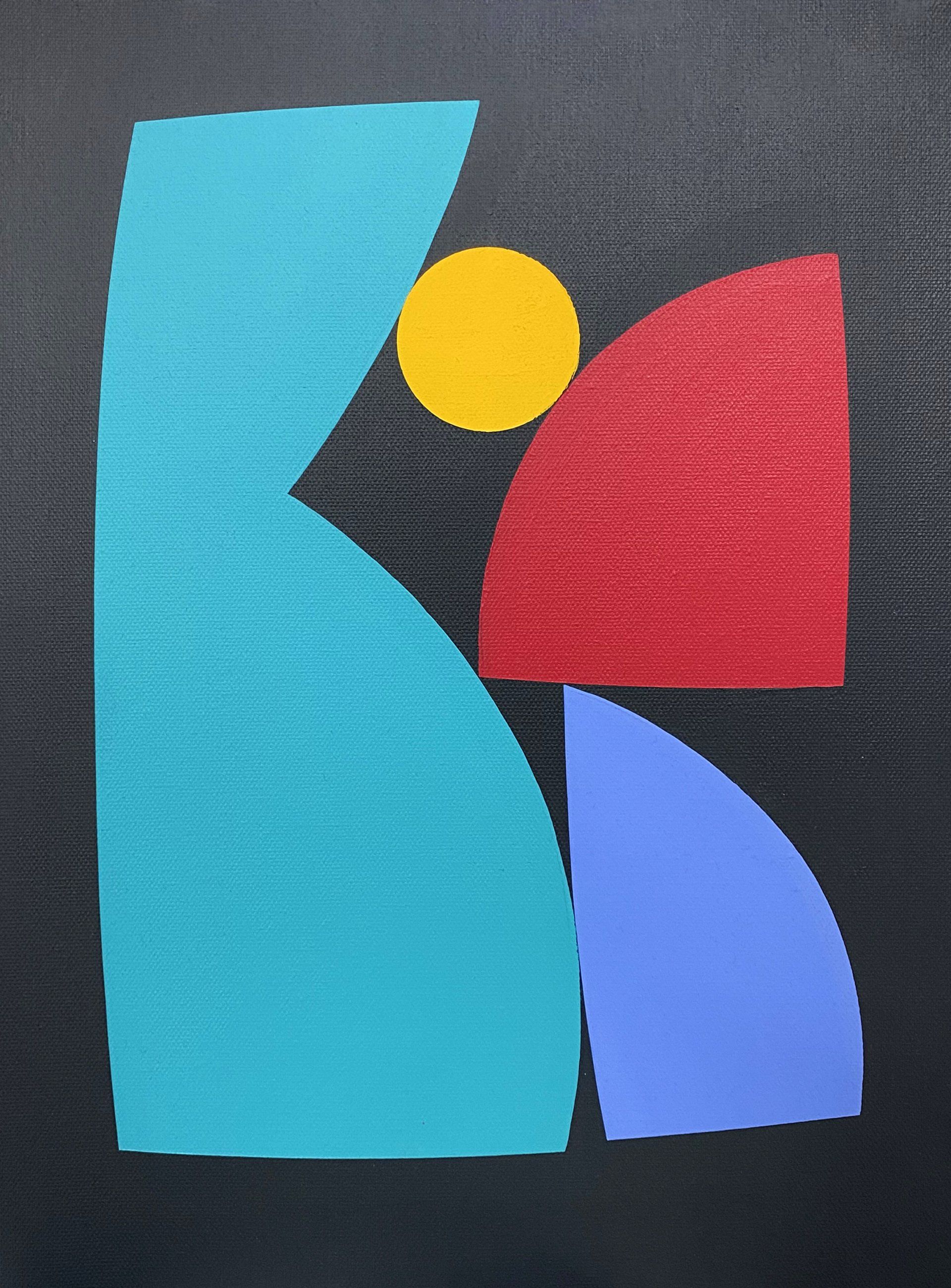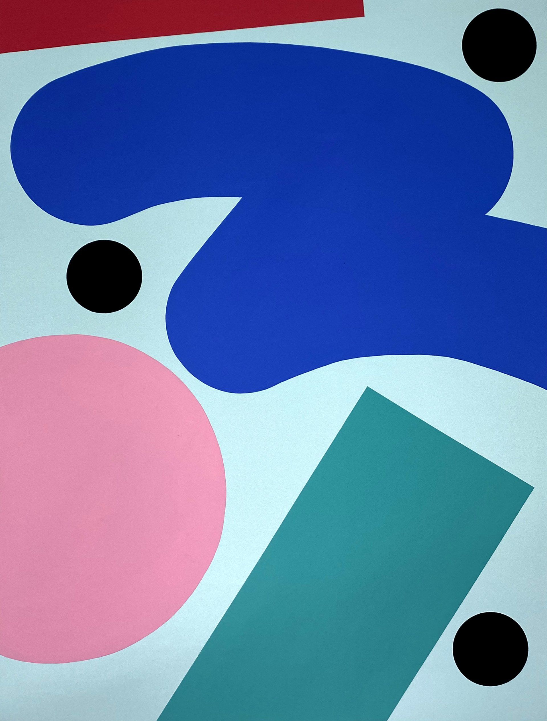 Penfold’s art dances on the surface of the canvas with a Matisse like airiness, using a pastel pallet and elements originally derived from comic book faces; over time his work has become increasingly abstracted, morphing into bold rhythmic geometric shapes. His compositions, informed by a printmaking logic have stretched beyond the canvas to fill the sides of vast buildings. He made a recent return to Cambridge to paint a mural at Hope Street Yard, one of a number on the streets of Cambridge. For Penfold it's fun, as he said for his solo show in Bristol in 2019;