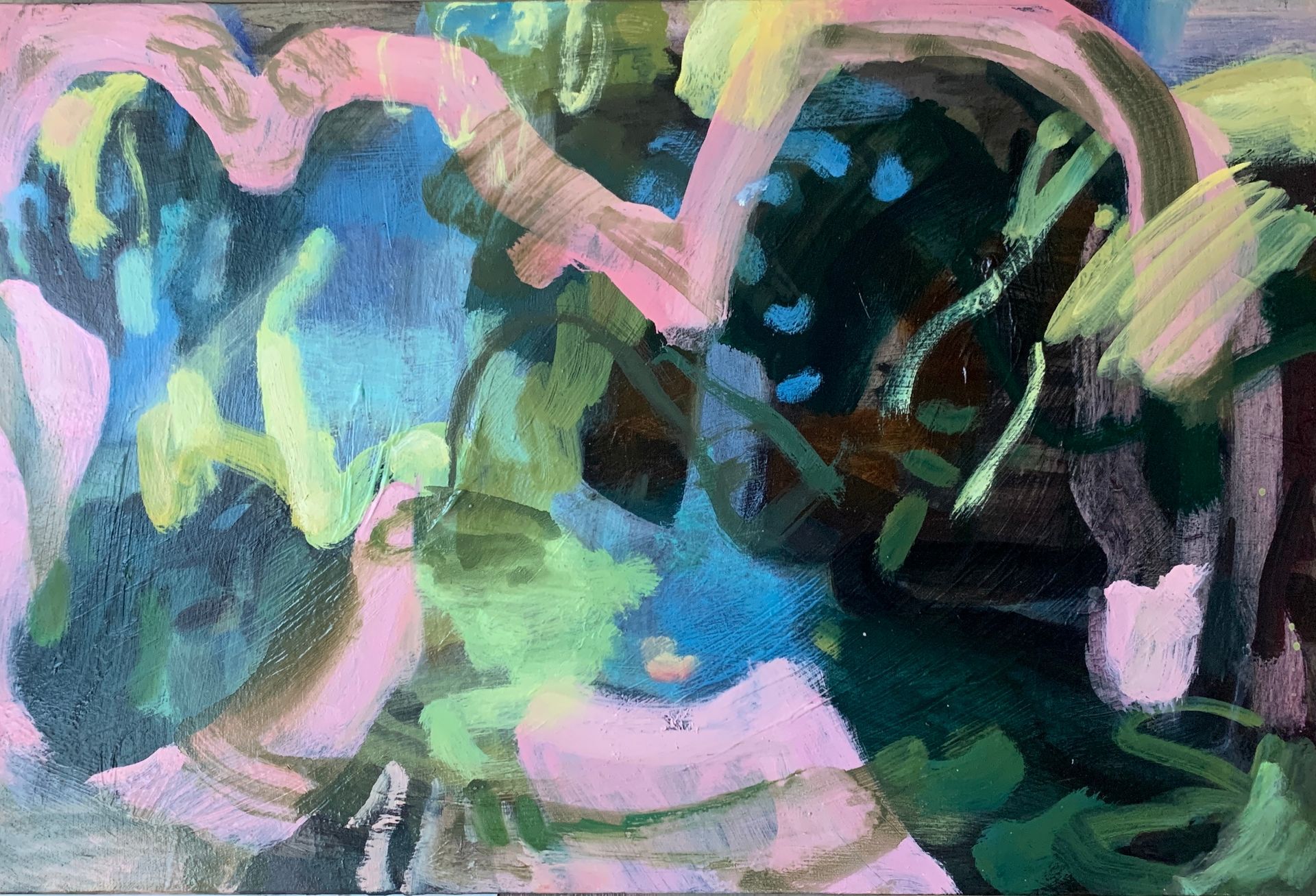 Lucy’s paintings for Inner Visions were inspired by frequent visits to Jubilee Woods in Hertfordshire. Her fascination with expressive tree forms which speak of hope, fear, tenderness and aggression fuse with an interest in classical mythology. The compelling stories of gods and humans in extreme, tragic, surreal, often comic situations have shaped our understanding of who and what we are helping us make sense of the human condition and Lucy’s work contributes to this centuries old conversation. Often Lucy’s figures appear complete with their story, but occasionally she borrows a pose from renaissance interpretations of classical mythology. Letting ideas form through various iterations of an image and allowing at each stage the accidents to trigger a new direction.